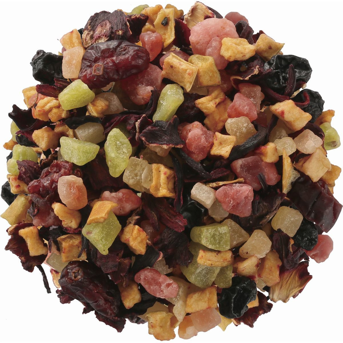 加糖ドライストロベリー(タイ製造)、加糖ドライキウイフルーツ、有機ハイビスカス、加糖ドライパパイヤ、加糖ドライクランベリー、加糖ドライブルーベリー、加糖ドライパイナップル、有機ドライアップル/香料、クエン酸、保存料(亜硫酸塩)、着色料(赤40、黄4、青1)